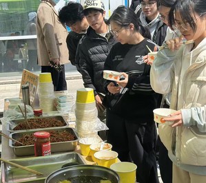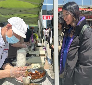 活动现场,供应商带来了米面粮油、肉类、豆制品等各类原材料。师生可通过“看、闻、问”直观感受食材品质,部分企业还设置了试吃环节,如现榨臭豆腐、凉拌千张丝、红烧肉、红烧鸡爪、米饭等,吸引众多师生驻足品尝。